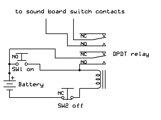 2. Four Train Sound Board #2 (EM-105) - this sound board only creates a brief sound from each button push so it should be used with the relay circuit below. A minor modification gives us: