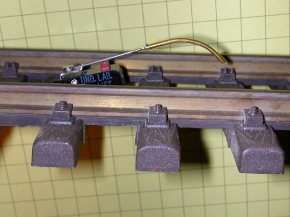 Here is one method of mounting a micro switch. First extend the switch's arm curving it gently so that a train passing in either direction will activate it. Then cut a section of tie so that the switch can be glued into the notch.