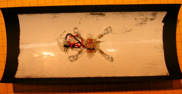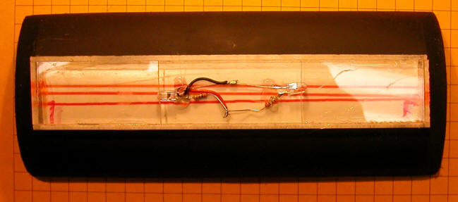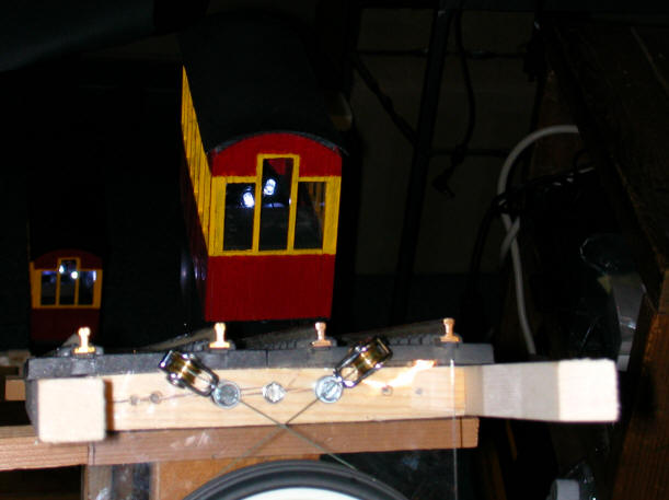 Here is a view of the amber LEDs that illuminate the interior of the car. Note that each LED has a current limiting resistor soldered in series with the power lead.