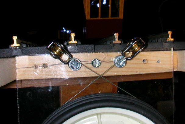 This system worked like a charm! That is not to say that there were no problems associated with the powered part of the incline. The first major problem came from my choice of braided fishing line for the incline’s cable. I thought that it would be ideal as it is available in dark colors and is pretty close to scale size. What I didn’t count on was the thin fishing line getting caught between the pulley's metal frame and the pulley itself. A switch to 1/16” nylon cord resolved this problem. The other adaptation was the path of the cord around the wheel. When it was looped under the wheel the cord tended to slip a bit. By crossing the cord across itself before looping it once around wheel nearly the entire wheel is in contact with the cord at all times.
