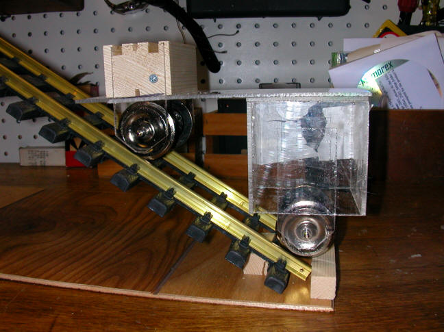 The base of each car is a wooden platform that is 2.4” x 6”. To keep this platform horizontal while riding on a 30 degree track a large compartment is under back end of the car. This compartment was once used for baggage and other cargo. In my model it measures 2.4” x 2.4”. In the photo below you can see a mock up of the car that I made from wood and Plexiglas.
