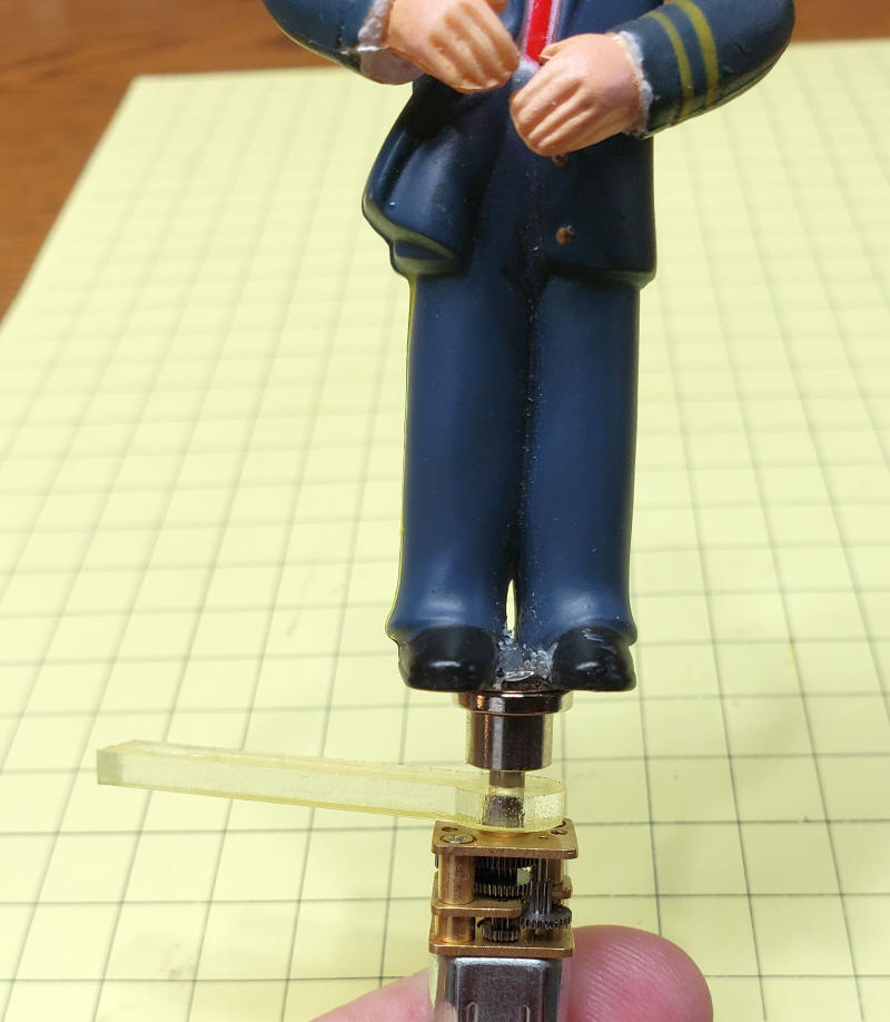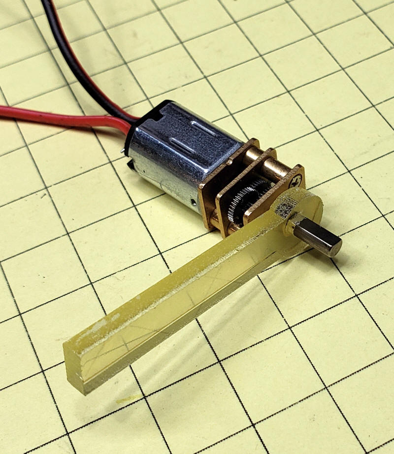 Options I have used small servos to move things in a number of animations (see:https://www.google.com/search?q=servo+animation&sitesearch=trainelectronics.com for several examples) Because of space limitations I would be unable to use a standard size servo, which I have found to be very reliable. I would be limited to using small, micro servos. These devices work well but typically are built with non-metal gears that tend to fail more often than their larger brothers. In addition servos require some sort of control circuit to tell them how to rotate. This also means that a power voltage regulator & filtering circuit would be needed. The other option that I considered was a small geared motor. I have used these devices and, with their metal gears, they have worked very well.