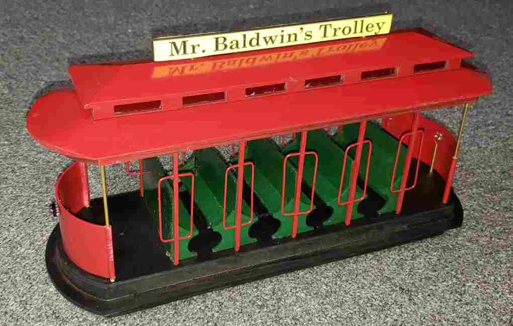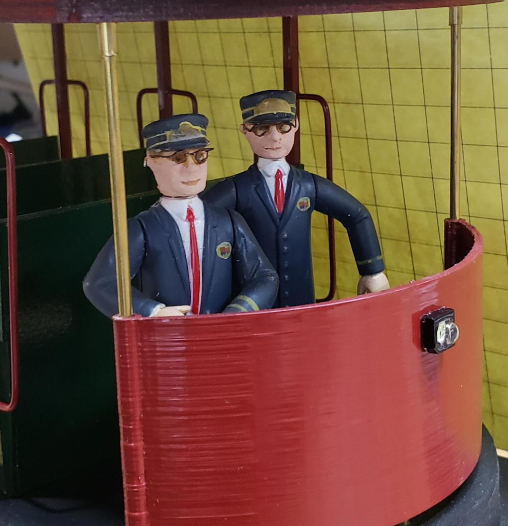 Introduction While there are a host of ways to rotate an object using motors, servos or other devices a simple gear motor provides an inexpensive and reliable alternative. I recently built a large scale trolley that will be installed at the local children's library to commemorate a friend who has passed away. The trolley is symmetrical at each end and I wanted to have two conductors on the trolley, one at each end. Since the trolley is set to follow a single run of track in a point-to-point configuration the conductors would be facing in the wrong direction half of the time. I could, of course, have both conductors facing forward but I thought it would be better to have them rotate so that they both faced in the direction of travel. Thus began a quest to find a reliable and simple way to get the two conductors to change direction at each end of the point-to-point. |